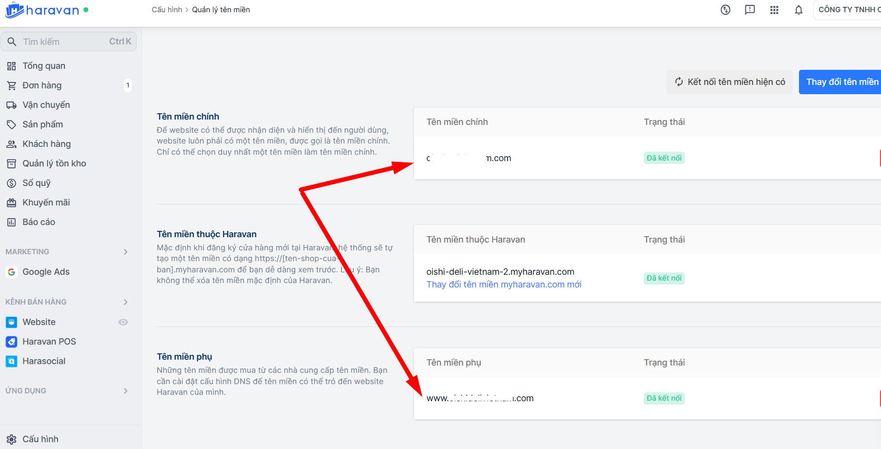Haravan cho phép bạn kết nối nhiều tên miền về website, tuy nhiên, bạn chỉ có thể chọn 1 tên miền để làm tên miền chính.