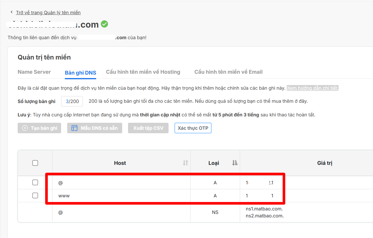 - Bước 2: Thêm địa chỉ IP vào DNS của nhà cung cấp tên miền
