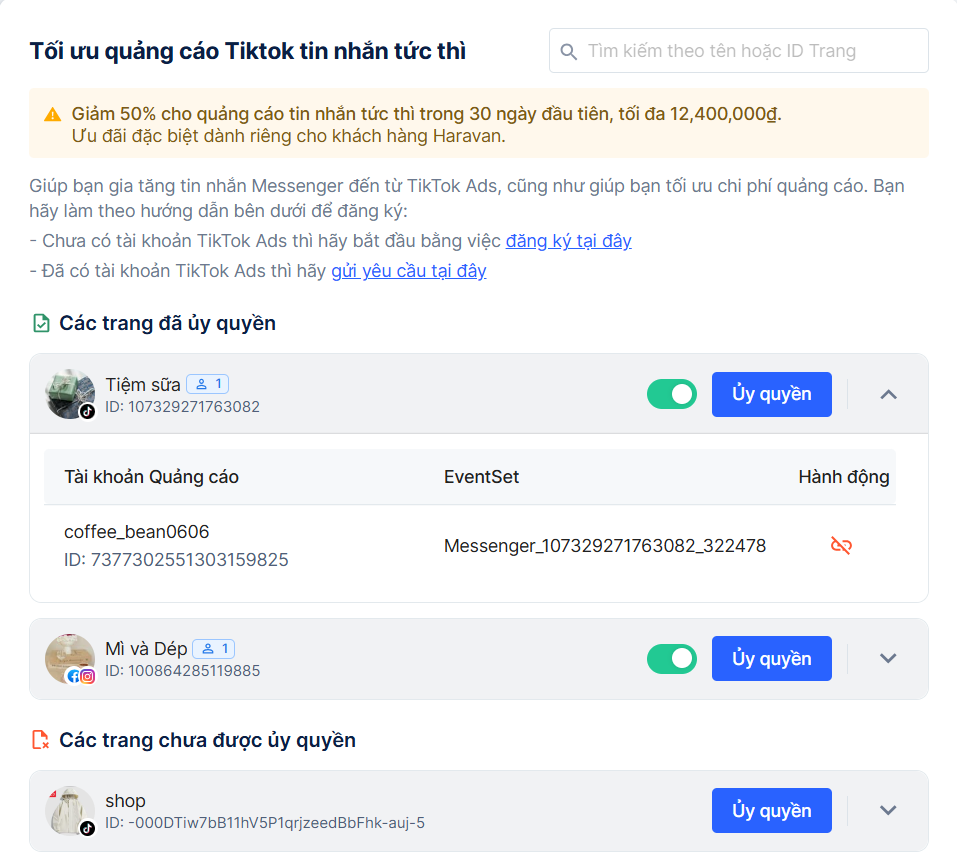 - Tại mục “Các trang chưa được Ủy Quyền", tìm trang bạn muốn kết nối và nhấn “Ủy quyền".
