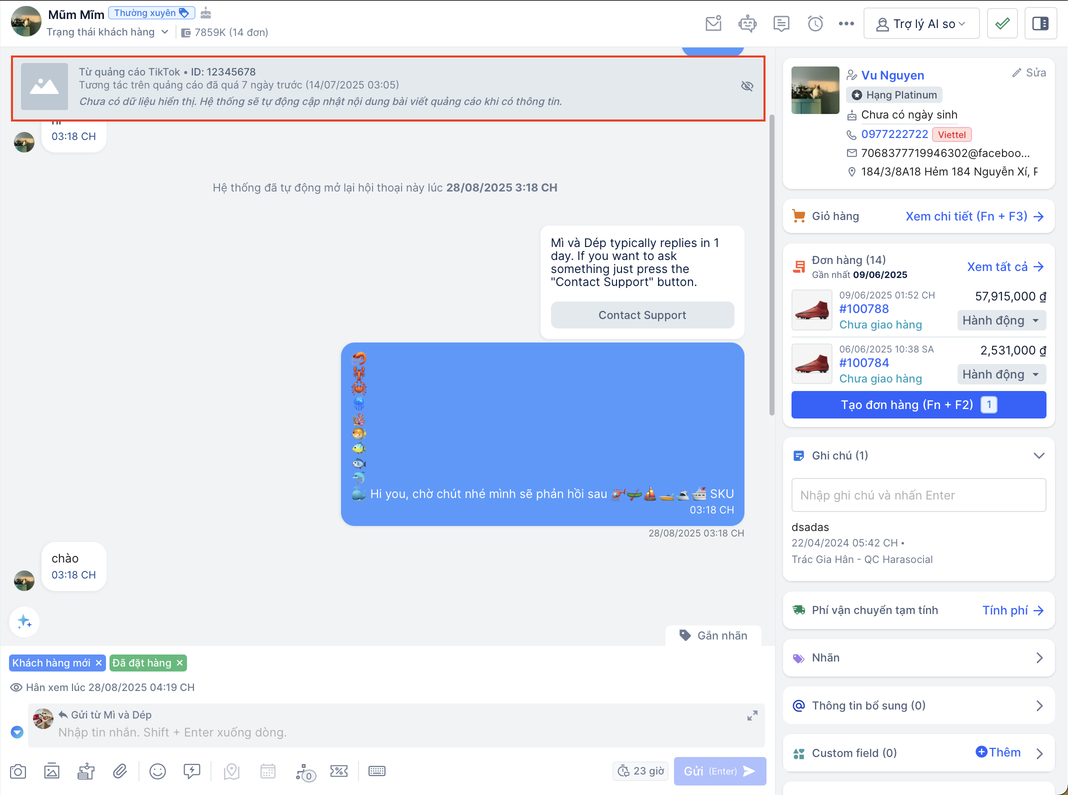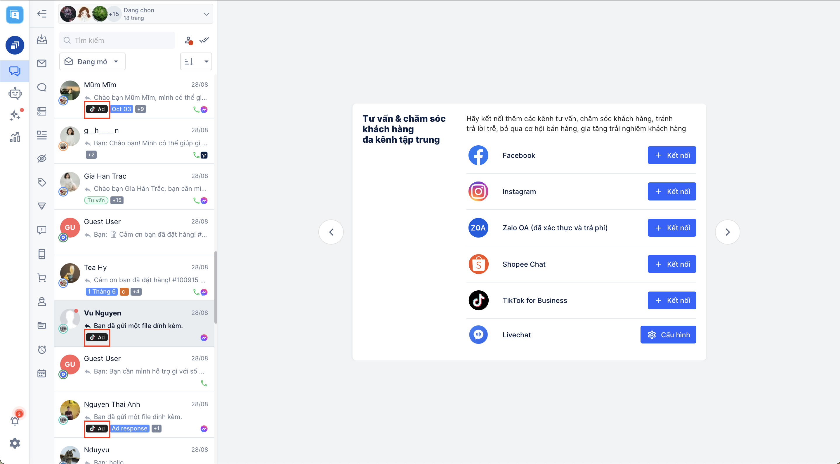 - Nhãn tự động: Các hội thoại đến từ quảng cáo TikTok sẽ được tự động gắn nhãn "Ad TikTok".