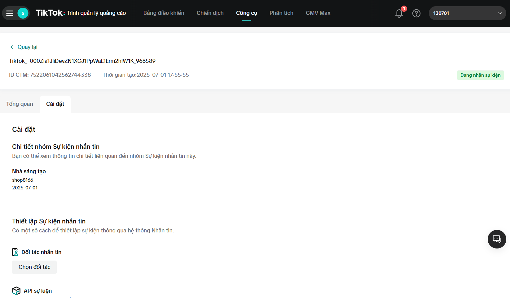 - Bạn có thể truy cập Công cụ (Tools) → Sự kiện (Events) trong trình quản lý quảng cáo TikTok để thấy Dataset tương ứng đã được tạo.