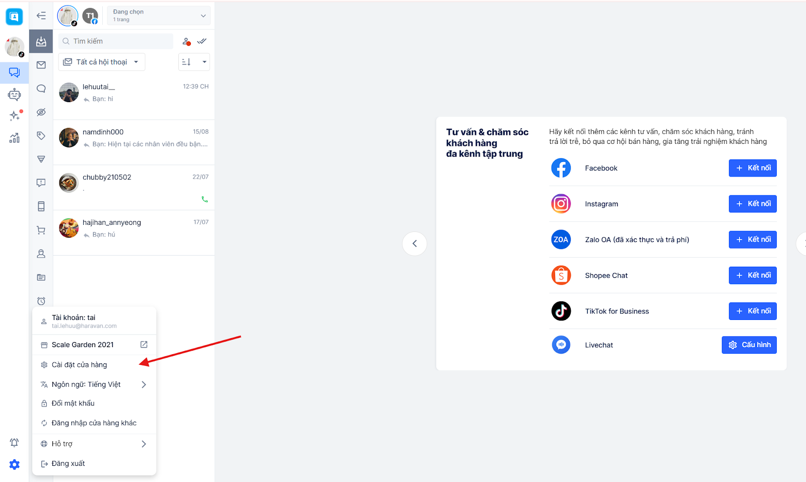 Bước 1: Sau khi kết nối kênh, chọn “Cài đặt” ở góc trái phía dưới của màn hình để mở hộp thoại và chọn “Cài đặt cửa hàng”.