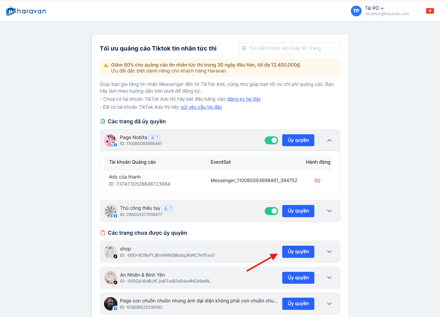 Bước 4: Chọn “Ủy quyền” tại trang muốn liên kết