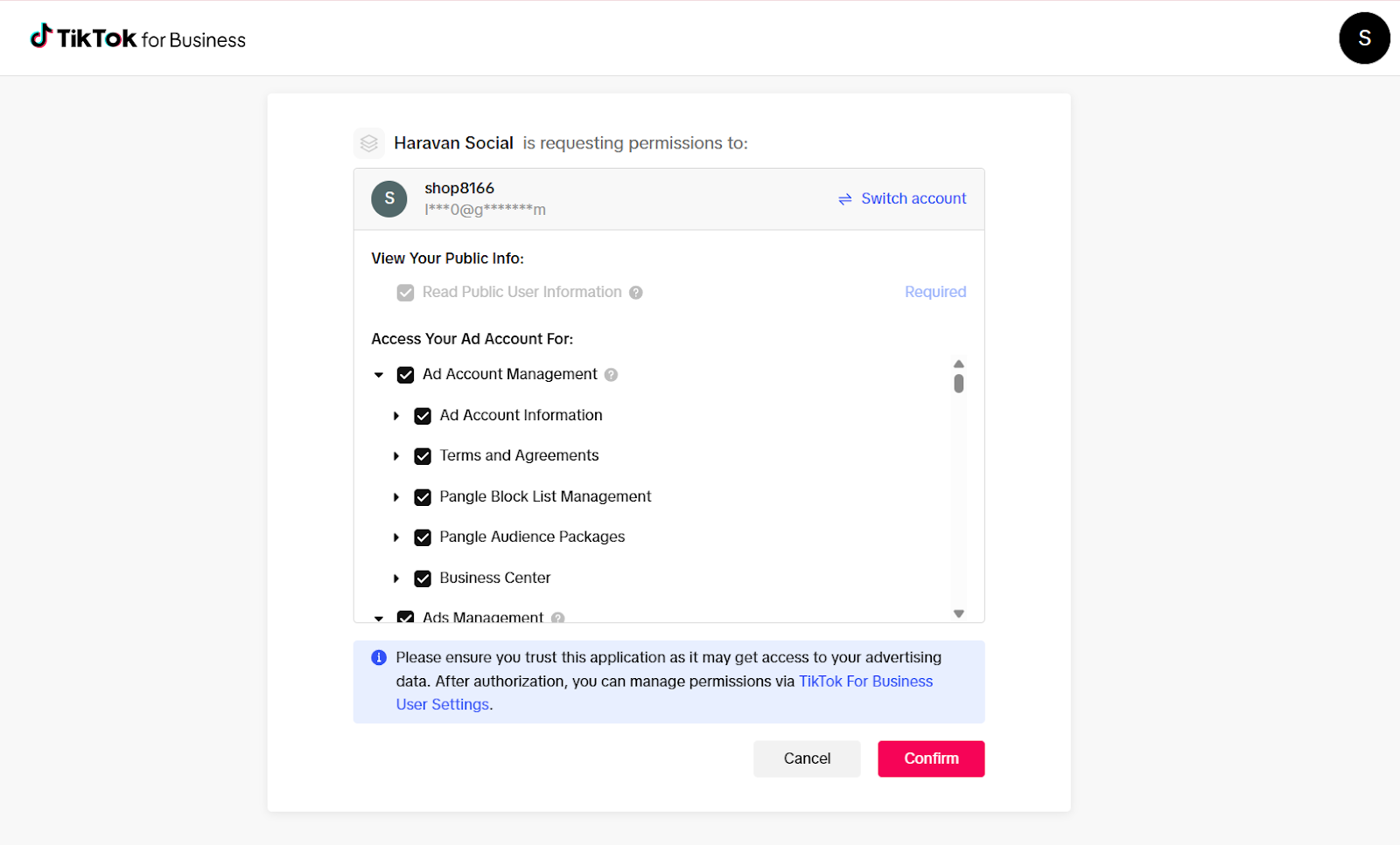 Bước 5: Sau khi chuyển sang trang cấp quyền của TikTok for Business, chọn “Confirm” để xác nhận ủy quyền